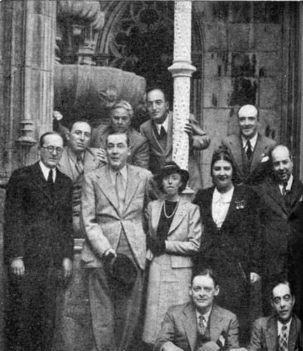 Seated are T. S. Eliot and Guilherme Pereira de Carvalho, editor of «Lisbon-Courier». — Middle row (from the left): Robert de Traz, Jacques de Lacretelle, Mme de Lacretelle, Mme. A Ferro [Fernanda de Castro], António Ferro — Upper row (from the left): Máximo Buontempelli, Aldo Bizarri, J. Silva Dias.